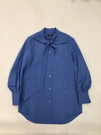 M-filのグログランリボン付きシャツ トリアセテートと綿ならではの上品な光沢と柔らかな風合いが特徴的な素材 ふんわりボリュームのある袖と 細めのボウタイリボンがポイント ¥49,500 #M-fil #エムフィル #エムフィルブラウス #エムフィルイージートラウザーパンツ #ミカコナカムラ #高松セレクトショップ #onsite #ootd #outfit