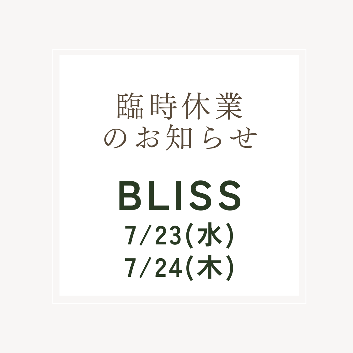 いつもご愛顧いただき有難うございます。 誠に勝手ながら、やむを得ない事情により 下記日程を臨時休業とさせていただきます。 【BLISS】 休業日: 7/23( 水) ・7/24( 木) ご来店いただいたお客様にはご迷惑をおかけしてしまい、心よりお詫び申し上げます。 引き続きのご愛顧のほど、よろしくお願いいたします。