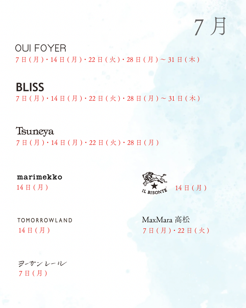 いつもFoyer Groupをご愛顧いただきまして、ありがとうございます。 7月、8月と夏季休暇をいただく店舗がございますので、画像にてご案内いたします。 ※7/13追記 以下、お休みが追加となりました。 7/15(火)BLISS お客様にはご不便をおかけいたしますが、ご確認のほどよろしくお願いいたします。