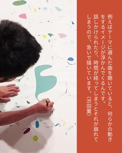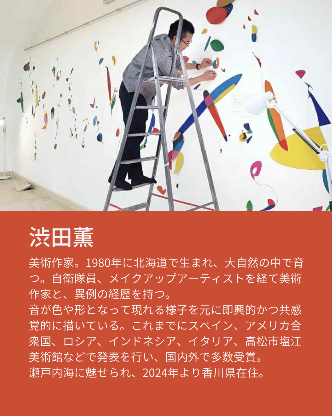 本展では、香川県在住の美術作家、渋田薫(1980-)に焦点を当てます。渋田は北海道の大自然の中で感性豊かに育ちました。“世界は音でつながっている”という渋田独自の考えを元に、のびやかで、みるものを心躍らせる作品を制作しています。