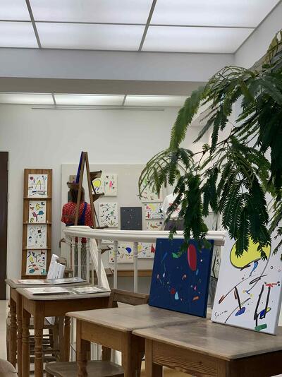 三椏珈琲室さんのおいしいドリンクを手に渋田さんのアートを楽しまれている